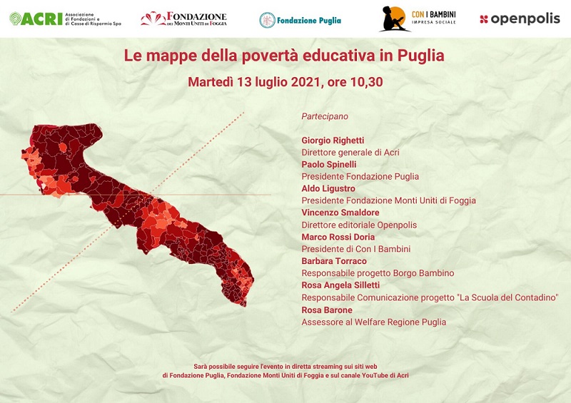 Si terrà martedì 13 luglio alle ore 10.30 la presentazione online del rapporto dell’Osservatorio #conibambini “Le mappe della povertà educativa in Puglia”. L’incontro, promosso da Acri, Fondazione Puglia, Fondazione Monti Uniti di Foggia e Con i Bambini, sarà trasmesso in diretta streaming sui siti di Fondazione Puglia e Fondazione Monti Uniti di Foggia, oltre che sul canale Youtube di Acri.