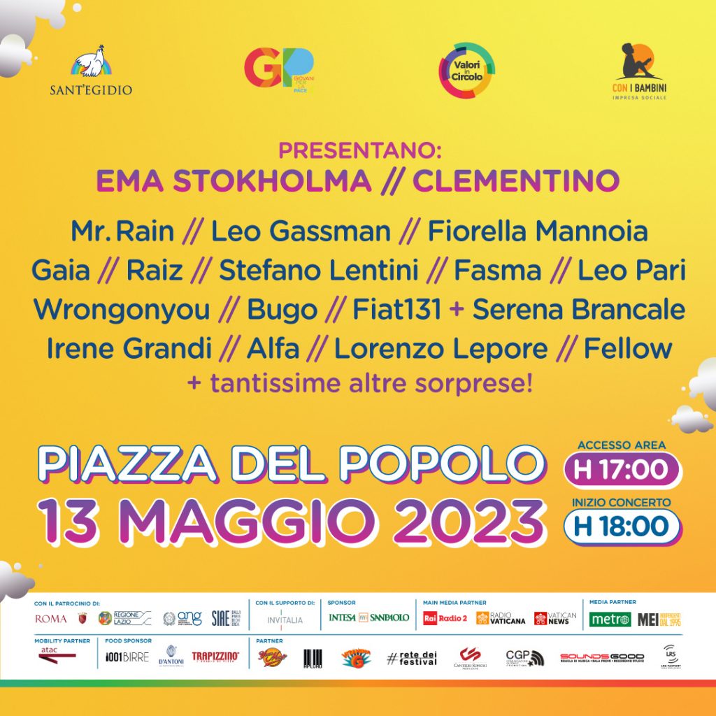 Il concerto prenderà il via alle 18 con i 12 finalisti del contest musicale “Play Music Stop Violence”, promosso dal movimento Giovani per la Pace. Giovani artisti e band emergenti, proporranno, quindi, nella splendida cornice di Piazza del Popolo, i loro brani originali all’insegna della pace, della solidarietà e dell’inclusione.