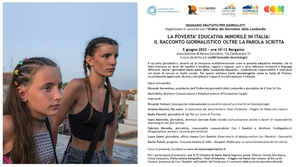 Incontro promosso da Con i Bambini in collaborazione con Giornale Radio Sociale e il progetto “Crescere insieme in valle“, cofinanziato dalla Fondazione della Comunità Bergamasca nell’ambito del Fondo per il contrasto della povertà educativa minorile, e in accordo con l’Ordine dei Giornalisti della Lombardia.