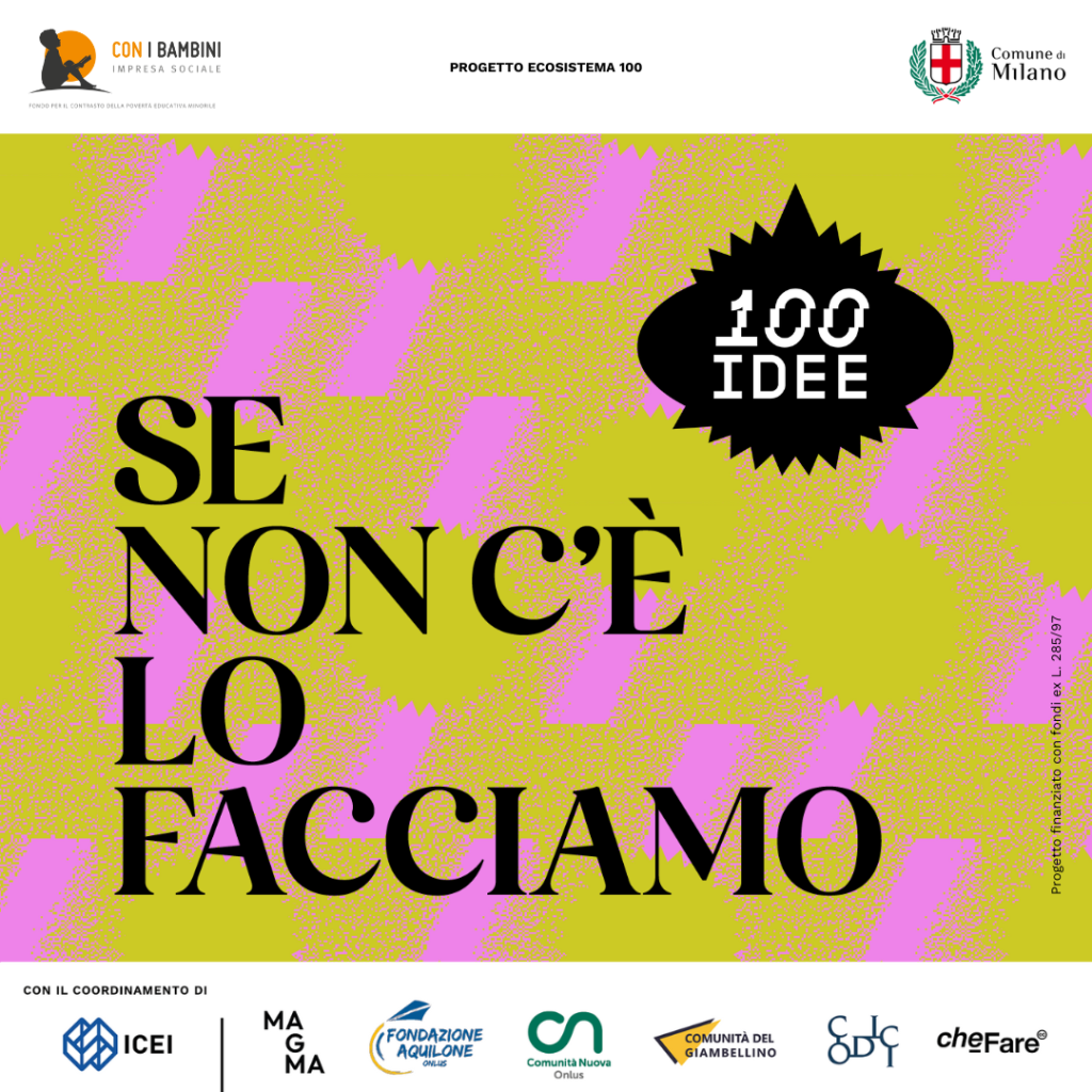 Cento iniziative pensate da ragazze e ragazzi diventeranno realtà grazie al progetto 100 Idee (Ecosistema 100), sostenuto da Comune di Milano e Con i Bambini nell’ambito del Fondo per il contrasto della povertà educativa minorile, realizzato in co-progettazione con ICEI – Istituto Cooperazione Economica Internazionale, ente capofila, e con i partner Codici Ricerca e Intervento, Associazione culturale cheFare, Comunità del Giambellino, Comunità Nuova, Fondazione Aquilone, Magma Impresa Sociale.