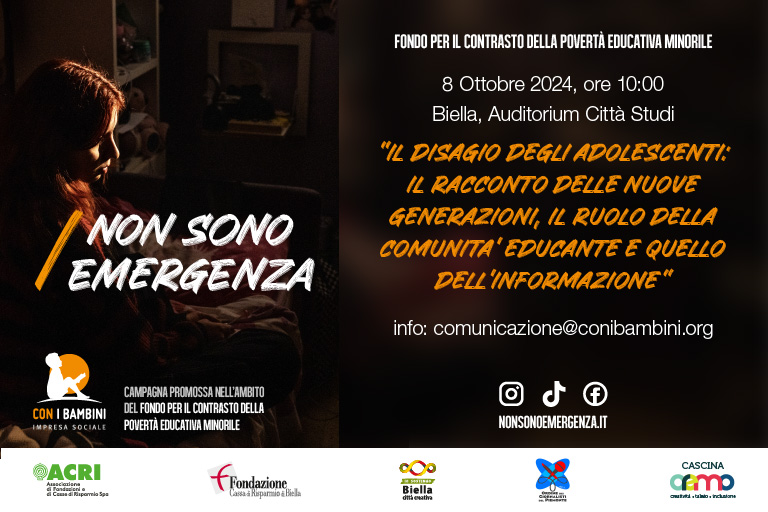 Con i Bambini, nell’ambito del Fondo per il contrasto della povertà educativa minorile, promuove la campagna partecipativa “Non sono emergenza” sul tema del disagio degli adolescenti. Partendo dai dati, dalle buone pratiche e soprattutto dall’ascolto diretto di ragazzi e ragazze, la campagna intende favorire una maggiore conoscenza e consapevolezza del fenomeno e promuovere il protagonismo delle nuove generazioni.