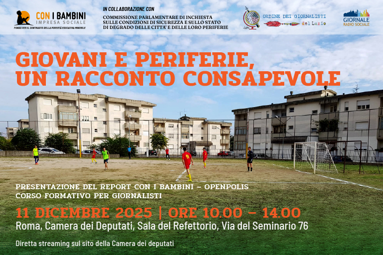 L’incontro, promosso da Con i bambini insieme alla Commissione parlamentare di inchiesta sulle periferie, all’Ordine regionale dei Giornalisti del Lazio e in collaborazione con il Giornale Radio Sociale intende offrire uno sguardo d’insieme sulla condizione dei giovani nelle periferie e nelle aree più vulnerabili del Paese: come sono vissute da bambini e adolescenti, i fenomeni di disagio ed emarginazione che generano, il ruolo delle comunità educanti, di cui anche i giornalisti ne fanno parte. Durante il corso verrà presentato il report “Giovani e periferie” realizzato dall’Osservatorio #Conibambini promosso da Con i bambini e Openpolis nell’ambito del Fondo per il contrasto della povertà educativa minorile.