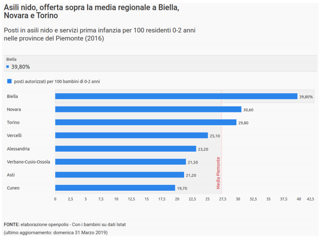 Piemonte e Veneto offrono la minor copertura, allo stesso livello: 27,3 posti in asili nido per 100 residenti tra 0-2 anni. Il Piemonte presenta i maggiori divari tra i livelli di offerta delle sue province. Tra la provincia di Biella e quella di Cuneo ci sono ben 20 punti percentuali di differenza nella copertura di asili nido.