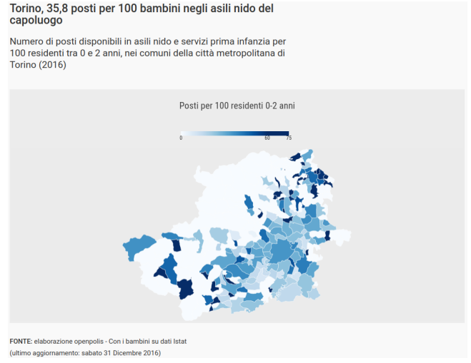 La città metropolitana di Torino è al terzo posto per offerta di asili nido, con un totale di 15.829 posti per gli oltre 54 mila residenti sotto i 3 anni. Sono il 47% i comuni della provincia di Torino che hanno asili nido o servizi prima infanzia. L’offerta di asili nido nella città metropolitana di Torino si concentra nelle aree dei 5 comuni polo. Mentre in una parte della città metropolitana il servizio è abbastanza diffuso, la situazione è diversa per una vasta area del territorio dove il servizio non arriva. Si tratta di comuni perlopiù montani che non dispongono di strutture e che confinano con comuni che a loro volta non hanno asili nido.