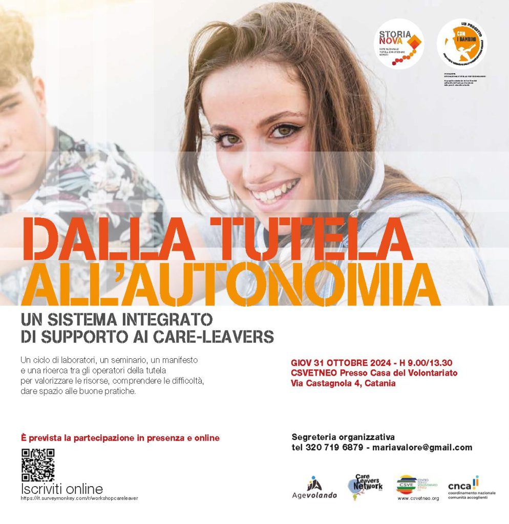 Sarà questo il tema del laboratorio Dalla tutela all’autonomia: un sistema integrato di supporto ai care leaver organizzato nell’ambito del progetto nazionale Storia Nova, con Agevolando e il Care Leavers Network in collaborazione con il CNCA (Coordinamento Nazionale delle Comunità Accoglienti) e con il Centro Servizi per il Volontariato Etneo.