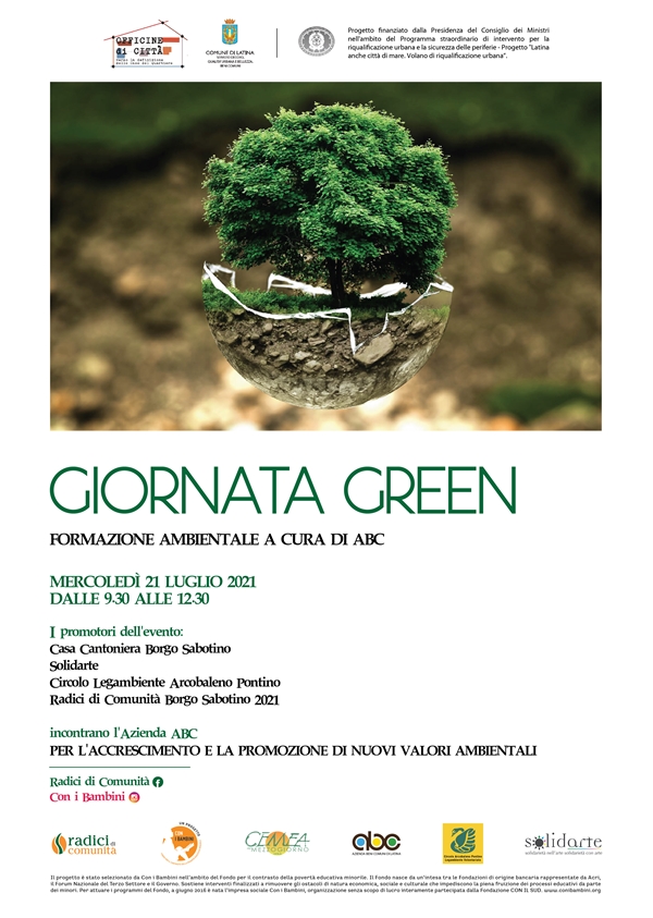 Una mattinata di giochi e laboratori, sulla salvaguardia dell’ambiente attraverso quel piccolo impegno quotidiano – piccolo ma determinante – che è la raccolta differenziata. È la “Giornata Green“, che si svolgerà mercoledì 21 luglio a Latina, precisamente a Borgo Sabotino, ed è stata pensata per i 54 bambini iscritti allo Spazio Gioco organizzato all’interno del progetto Radici di Comunità, ma è aperta a tutti.