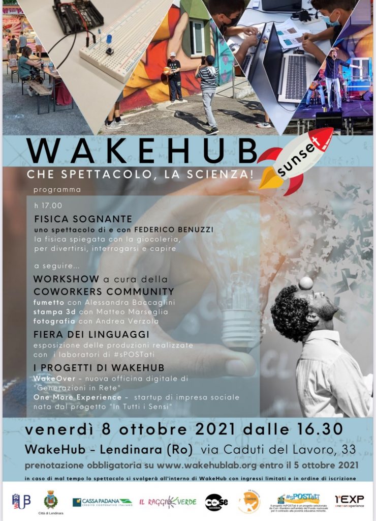 WakeHub Sunset è l’appuntamento fisso della community di WakeHub che apre le porte dello spazio nel comune di Lendinara (Rovigo) a tutta la comunità, dando modo al pubblico di poter vedere da vicino le attività che vengono svolte durante l’anno grazie a progetti come #sPOSTati.