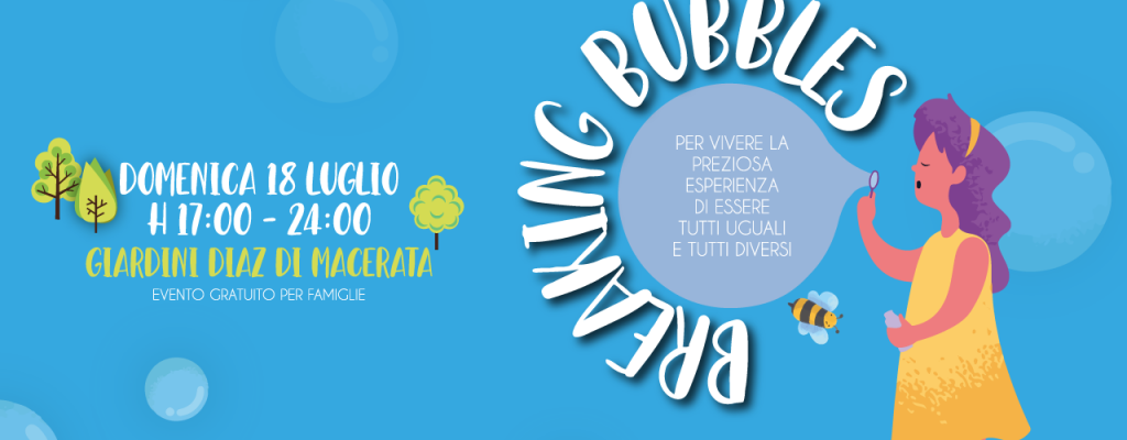 Appuntamento il 18 luglio alle 17:00 presso i Giardini Diaz di Macerata con l’evento “Breaking Bubbles”, letteralmente “Rompere le bolle”, dove le bolle sono l’isolamento delle famiglie con bambini autistici.