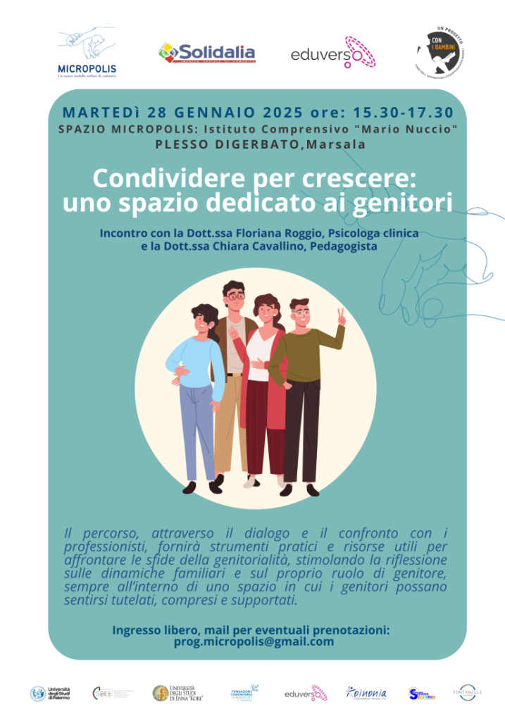 In programma il 28 gennaio 2025, dalle ore 15:30 alle 17:30, nello Spazio Micropolis di Marsala, presso l’Istituto Comprensivo “Mario Nuccio” – Plesso Digerbato, l’incontro dal titolo “Condividere per Crescere”, un’iniziativa pensata per sostenere i genitori nel loro importante ruolo educativo dal progetto Micropolis.