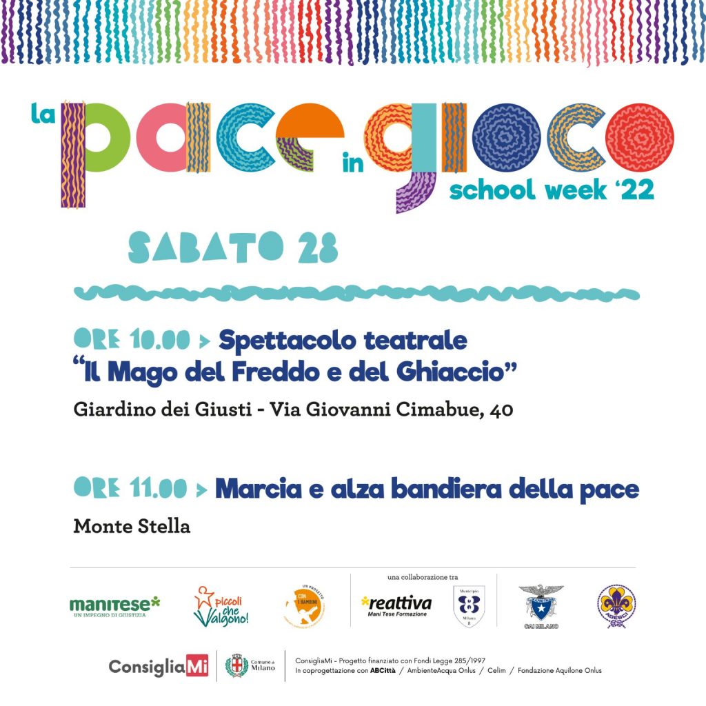 Dal 23 al 28 maggio 2022, con il titolo “la Pace in Gioco”, torna la School Week del Municipio 8 del Comune di Milano: un programma di oltre 40 eventi che coinvolgono la comunità educante, studenti, docenti, genitori e i cittadini, dedicato ai temi della pace e del diritto al gioco.