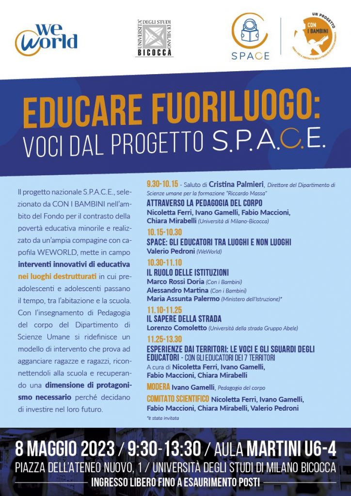 Lunedì 8 maggio si terrà all’Università degli Studi di Milano-Bicocca “Educare Fuoriluogo: voci dal progetto S.P.A.C.E.”, un evento aperto al pubblico sull’importanza di interventi innovativi di educativa di strada nei luoghi destrutturati in cui preadolescenti e adolescenti passano il tempo, tra l’abitazione e la scuola.