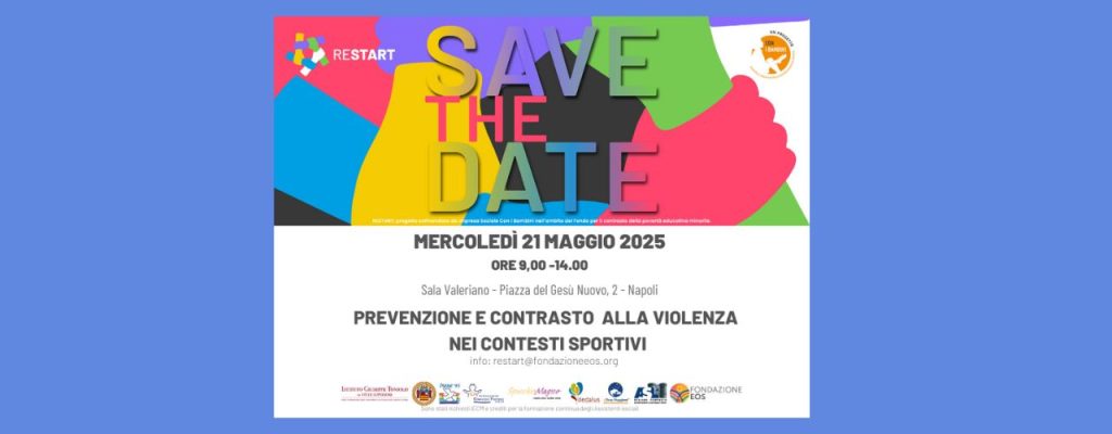 In occasione della designazione di Napoli come Capitale Europea dello Sport 2026, la Fondazione Eos Onlus nell’ambito del progetto RESTART – che ha come obiettivo la sperimentazione in Campania di un modello integrato di prevenzione e risposta precoce a fenomeni di maltrattamento minorile – propone una giornata formativa sul tema della prevenzione e contrasto alla violenza nei contesti sportivi che si terrà mercoledì 21 maggio 2025 dalle 9.00 alle 14.00, presso la Sala Valeriano in Piazza del Gesù Nuovo, 2 a Napoli con il contributo di figure istituzionali, esperti, sportivi, survivor.
