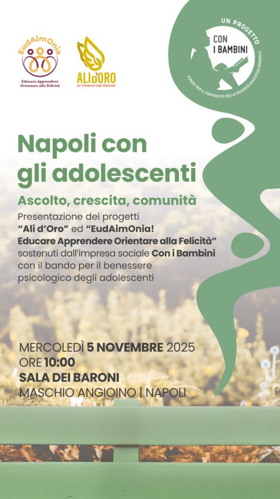 Mercoledì 5 novembre 2025 ore 10,00 presso la Sala dei Baroni, Maschio Angioino, Napoli, si terrà la presentazione dei progetti Ali d’Oro ed EudAimOnia! Educare Apprendere Orientare alla Felicità, selezionati da Con i Bambini nell’ambito del Fondo per il contrasto della povertà educativa minorile.