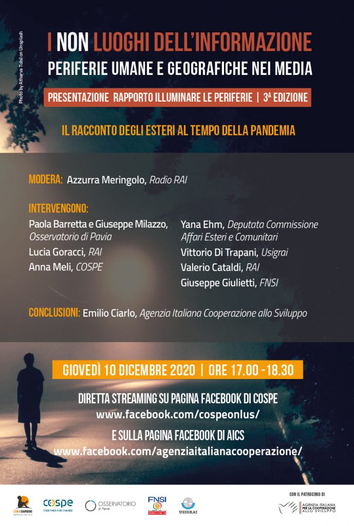 Oggi dalle ore 17 conferenza online per la presentazione del rapporto di ricerca “Illuminare le periferie”, curato dall’Osservatorio di Pavia e promosso da COSPE onlus, USIGRai, FNSI – Federazione Nazionale Stampa Italiana con il contributo dell’ Agenzia Italiana per la Cooperazione allo Sviluppo e da quest’anno, anche dell’Impresa Sociale Con i Bambini.