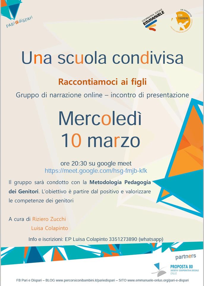 Incontro di presentazione della Pedagogia dei genitori, per genitori e insegnanti che prevede un laboratorio tematico a cura di Una Scuola Condivisa, nell’ambito del progetto Pari e Dispari selezionato da Con i Bambini.
