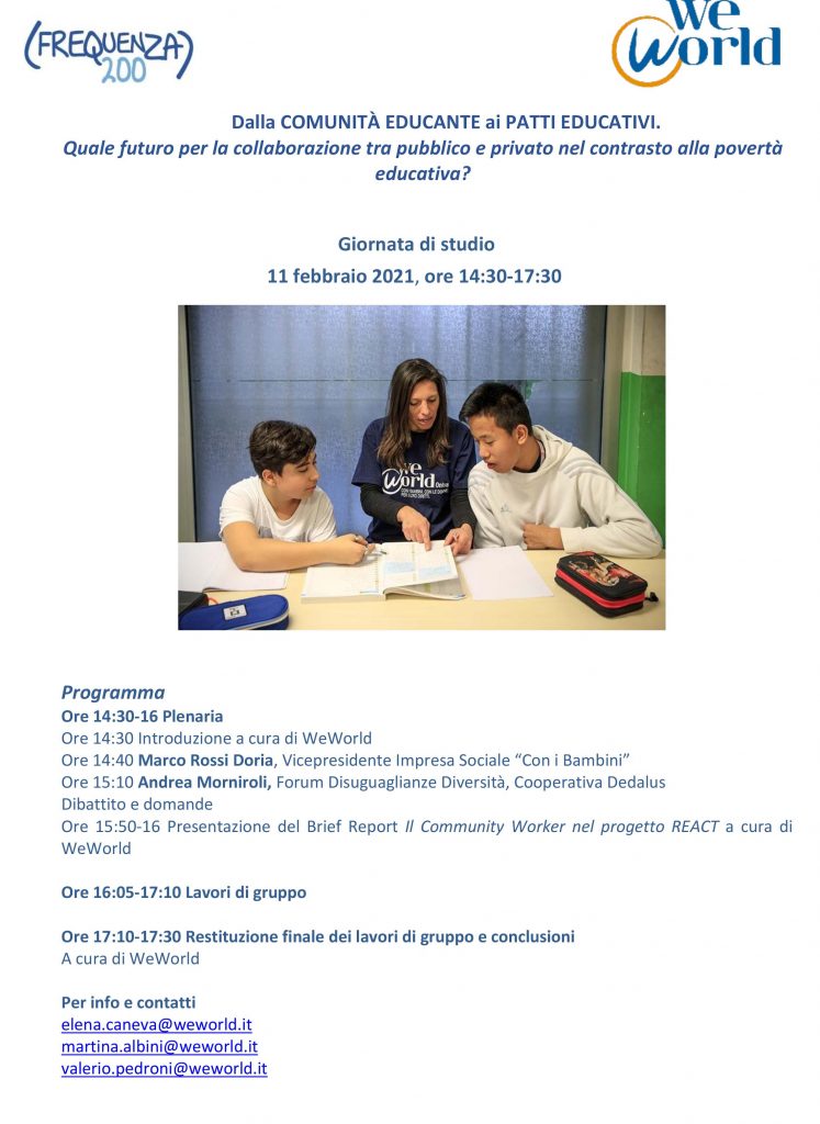 Se ne parlerà giovedì 11 febbraio alle ore 14.30 nel webinar “Dalla comunità educante ai patti educativi“, promosso da WeWorld e i partner della rete Frequenza200.
