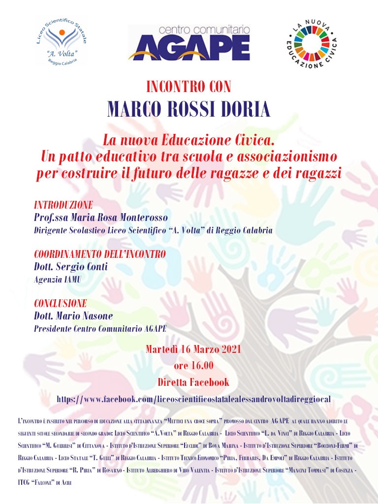 Il 16 marzo alle ore 15.30 sulla pagina facebook del Liceo Scientifico Statale “Alessandro Volta” di Reggio Calabria si terrà l’incontro con Marco Rossi Doria, vice presidente Impresa sociale Con i Bambini e maestro di strada, su “La nuova Educazione civica. Un patto educativo tra scuola e associazionismo per costruire il futuro delle ragazze e dei ragazzi” promosso dal centro comunitario Agape.