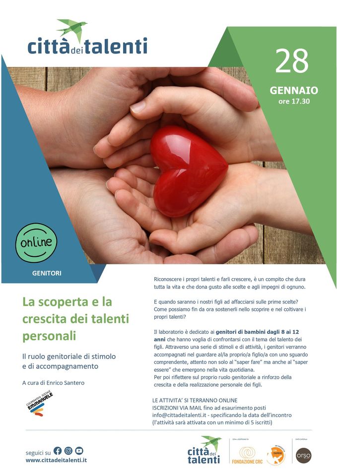 Mercoledì 28 gennaio alle ore 17.30 si terrà l‘incontro per i genitori “La scoperta e la crescita dei talenti personali” a cura di Cooperativa Emmanuele