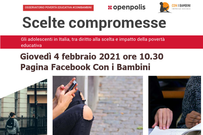 Giovedì 4 febbraio alle ore 10.30 in diretta streaming sulla pagina Facebook e sul sito di Con i Bambini ci sarà la presentazione del report “Scelte compromesse – Gli adolescenti in Italia, tra diritto alla scelta e impatto della povertà educativa”.