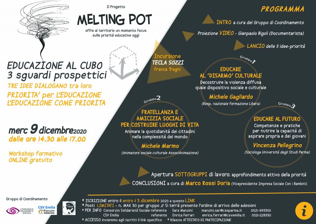 Il 9 dicembre dalle 14.30 alle 17 workshop formativo online gratuito dal titolo “Educazione al cubo. Tre sguardi prospettici”. Tre idee dialogano tra loro: priorità per l’educazione. Educazione come priorità.