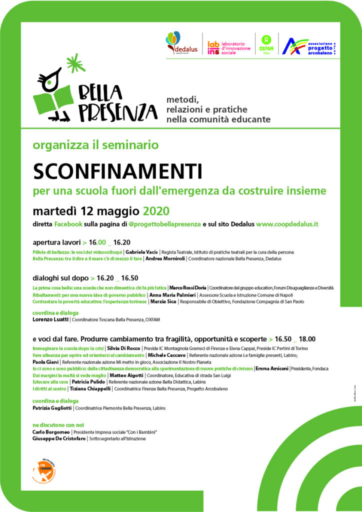Dal - AlBella Presenza promuove il seminario “Sconfinamenti. Per una scuola fuori dall’emergenza da costruire insieme”. Appuntamento il 12 maggio in diretta facebook sulla pagina @progettobellapresenza e sul sito www.coopdedalus.it