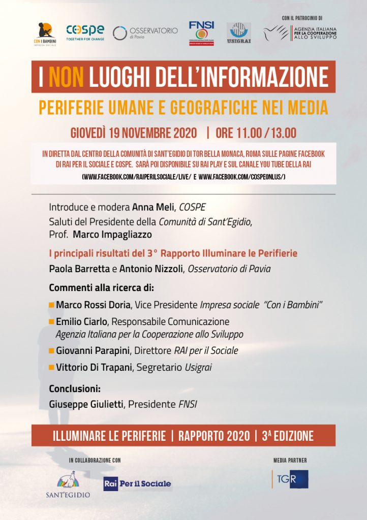 “Questa terza edizione è un numero speciale che nasce dell’epoca del Covid-19”, ricorda il segretario dell’USIGRAI Vittorio di Trapani: “una crisi sanitaria che sta attraversando il mondo e che ha già causato i primi effetti economici e sociali: il divario tra ricchi e poveri è ulteriormente cresciuto. Questo rende ancora più indispensabile il rapporto ‘Illuminare le periferie’ come strumento di lavoro delle redazioni, come luce-guida verso le periferie economiche e sociali”.