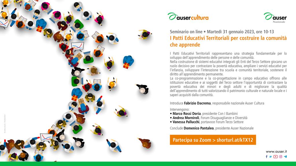 Il 31 gennaio dalle 10 alle 13 si terrà il seminario promosso da Auser Cultura e Auser Nazionale sui Patti Educativi Territoriali.