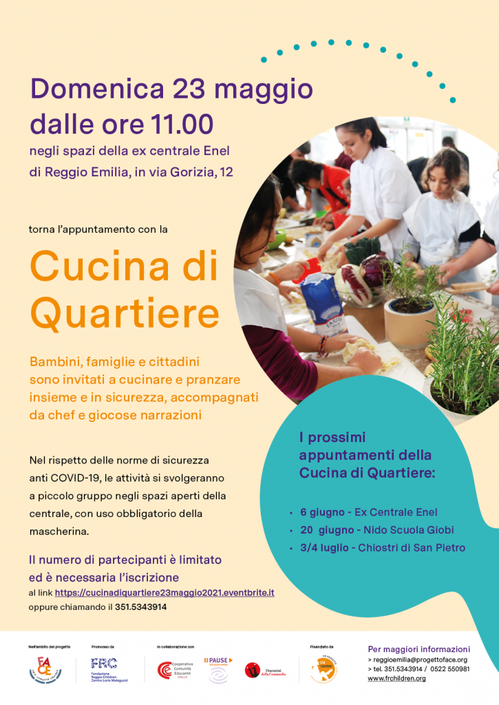 Il progetto FA.C.E. promuove il primo di quattro appuntamenti con la Cucina di quartiere: “La Cucina di Quartiere vuole essere punto di partenza per la costruzione e il rafforzamento di relazioni, partendo dall’azione comune del cucinare insieme per portare in tavola le proprie biografie culinarie, le tradizioni, i ricordi per creare nuove reti e nutrire relazioni tra le persone. La cucina di quartiere vuole essere un nuovo modo di vivere il vicinato, lo spazio pubblico, perché mangiare insieme non significa solo essere commensali ma anche compagni di viaggio.”