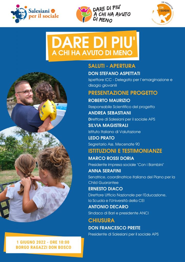 L’evento finale del progetto si svolgerà il 1 giugno, dalle ore 10, al Borgo Ragazzi Don Bosco di Roma (Via Prenestina 468, 00177 Roma): saranno presentati i risultati raggiunti grazie alla sintesi del comitato scientifico e ascoltate le testimonianze di chi ha vissuto il progetto da vicino.