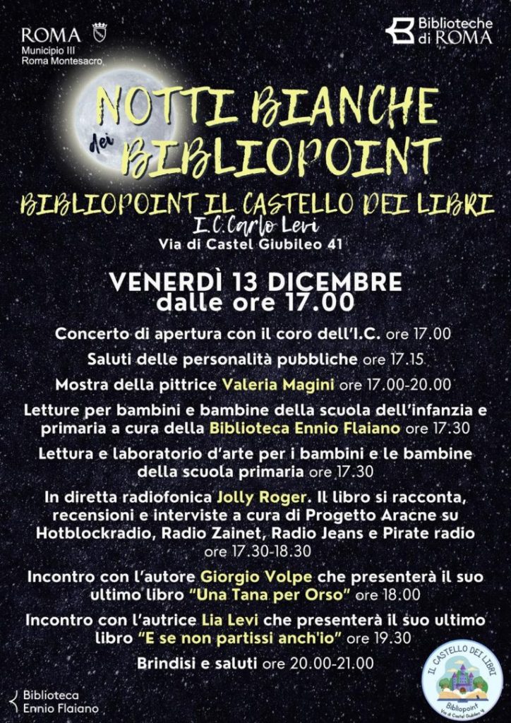 La Comunità Educante del III Municipio, insieme a Biblioteche di Roma, presenta all’I.C. Carlo Levi di Via di Castel Giubileo 41, a Roma, l’evento Notti bianche del Bibliopoint – Il castello dei libri, che coinvolge bambini, ragazzi e famiglie nel magico e infinito mondo della lettura.
