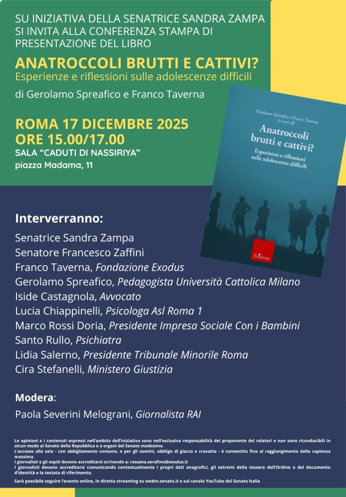 Il 17 dicembre alle 15 presso la Sala Caduti di Nassiriya in piazza Madama 1, Roma, si terrà la conferenza stampa di presentazione del libro “Anatroccoli brutti e cattivi? Esperienze e riflessioni sulle adolescenze difficili” di Gerolamo Spreafico e Franco Taverna.
