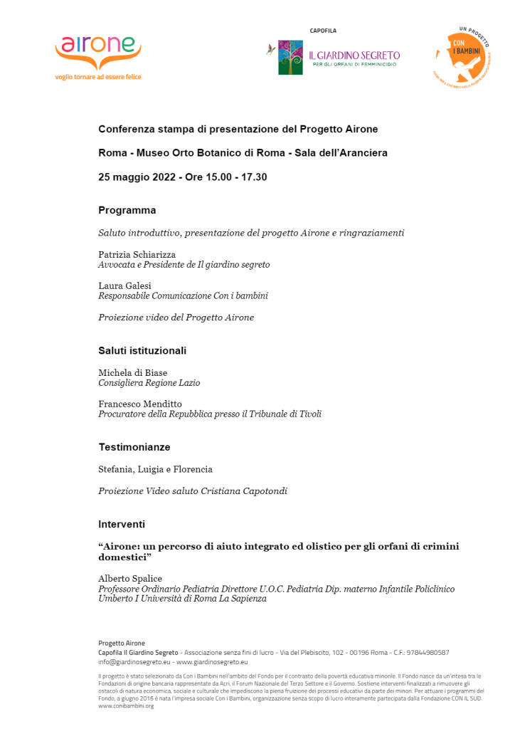 Airone è uno dei quattro progetti selezionati dal bando “A braccia Aperte”, promosso dall’Impresa Sociale Con I Bambini nell’ambito del Fondo per il contrasto alla povertà educativa. È un programma di prevenzione, assistenza, presa in carico e cura degli orfani di femminicidio, che nasce e viene elaborato da un prestigioso partenariato guidato dall’associazione per la tutela dei bambini Il Giardino Segreto, capofila per il centro Italia (Lazio, Toscana, Abruzzo, Molise, Marche ed Umbria).