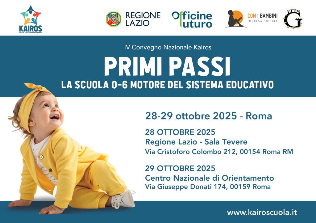Il Convegno “Primi Passi”, IV edizione dell’evento nazionale organizzato dalla Cooperativa Kairos, in collaborazione per l’edizione 2025 con il Centro Nazionale di Orientamento e la Rete Officine Futuro, si svolgerà il 28 e 29 ottobre 2025 a Roma.