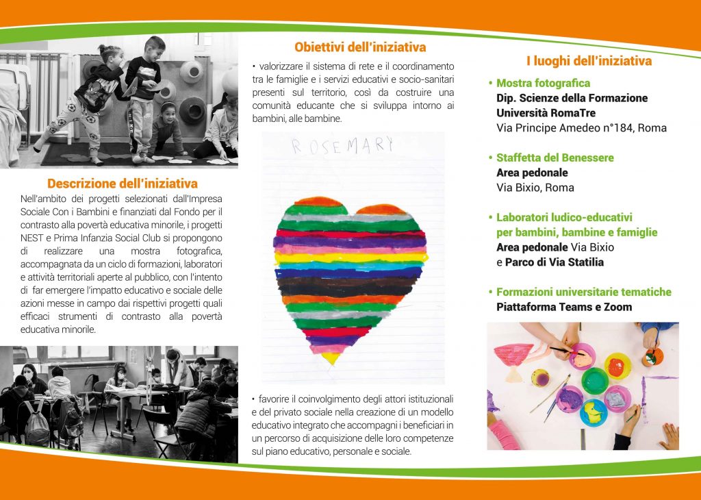 Nell’ambito dei progetti selezionati dall’Impresa Sociale Con i Bambini e finanziati dal Fondo per il contrasto alla povertà educativa minorile, i progetti NEST e Prima Infanzia Social Club si propongono di realizzare una mostra fotografica sul tema dei minori e delle periferie (quelle del centro della città e quelle dei sobborghi), accompagnata da un ciclo di formazioni, laboratori e attività territoriali aperte al pubblico, con l’intento di far emergere l’impatto educativo e sociale delle azioni messe in campo dai rispettivi progetti quali efficaci strumenti di contrasto alla povertà educativa minorile.