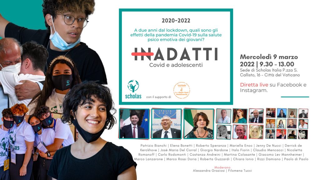 Il 9 marzo si svolgerà in modalità presenziale – presso la sede di Scholas Occurrentes in piazza San Calisto 16, Città del Vaticano – ed in modalità virtuale attraverso i canali social il convegno “InAdatti: Covid e adolescenti”.