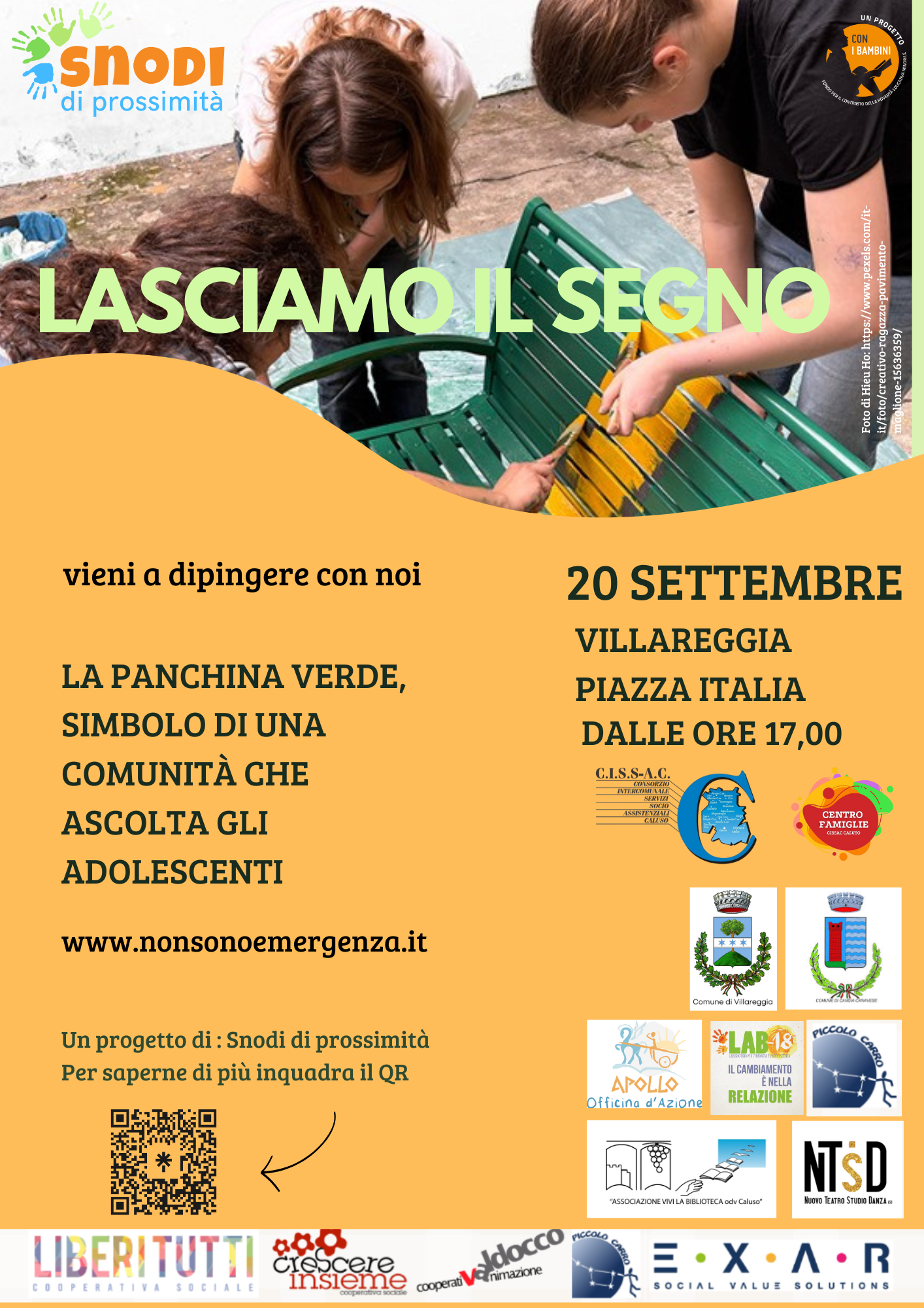 Il 20 settembre dalle 17 in piazza Italia a Villareggia (TO) ci sarà l’iniziativa “Lasciamo il segno” promossa dal progetto Snodi di prossimità, in cui gli adolescenti del posto sono invitati a dipingere la panchina della campagna “Non sono emergenza” promossa da Con i Bambini nell’ambito del Fondo per il contrasto della povertà educativa minorile.