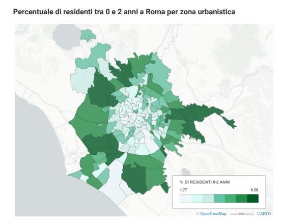 A Roma vivono 66 mila bambini sotto i 3 anni, cioè il 2,3% della popolazione romana. La loro presenza aumenta man mano che ci si allontana dal centro: la ragione è certamente legata ai prezzi inaccessibili delle abitazioni. In nessuna delle 15 zone con i prezzi immobiliari più alti, la percentuale di bimbi tra 0 e 2 anni raggiunge il 2%, con la sola eccezione del quartiere Trieste (2,3%). Nel centro storico, dove il valore medio al metro quadro sfiora gli 8 mila euro, i residenti con meno di tre anni sono l’1,38%. Al contrario, nelle aree con i prezzi più bassi, spesso la quota di minori sotto i 3 anni supera il 3%.