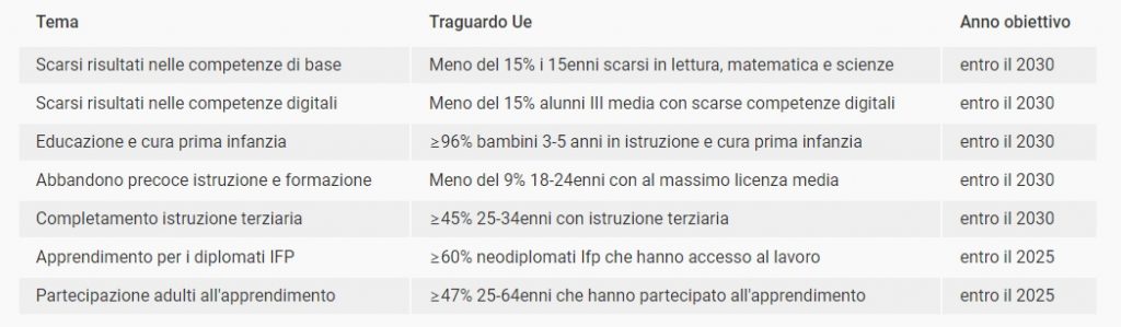 Anche di fronte a tali mutamenti l'Unione europea ha fissato un nuovo quadro di obiettivi sempre più sfidanti sull'istruzione. Sette target che vanno dall'ulteriore abbattimento dell'abbandono scolastico all'aumento dei laureati, dall'estensione dei servizi per l'infanzia al miglioramento dei risultati scolastici.
