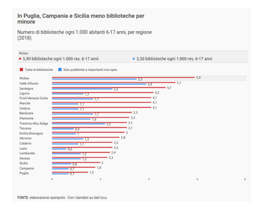Se si considerano tutte le circa 18mila biblioteche (di cui non è possibile ricostruire quante destinate anche ai minori), la diffusione massima si