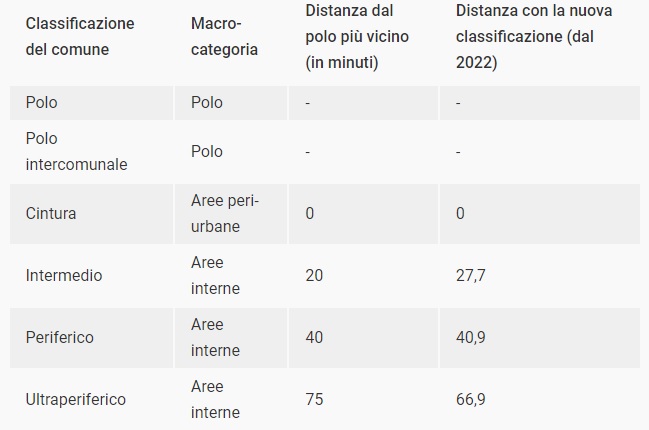 Una volta stabiliti i poli (cioè i comuni baricentrici per la presenza di servizi) sono definite le varie fasce, in base alla distanza in termini di tempo da questi centri. Un comune ad esempio è considerato di cintura se si trova entro 27,7 minuti dal polo più vicino (erano 20 nella precedente classificazione). Tra 27,7 minuti e 40,9 è intermedio. Tra 40,9 e 66,9 è periferico. Oltre i 66,9 minuti è ultraperiferico.