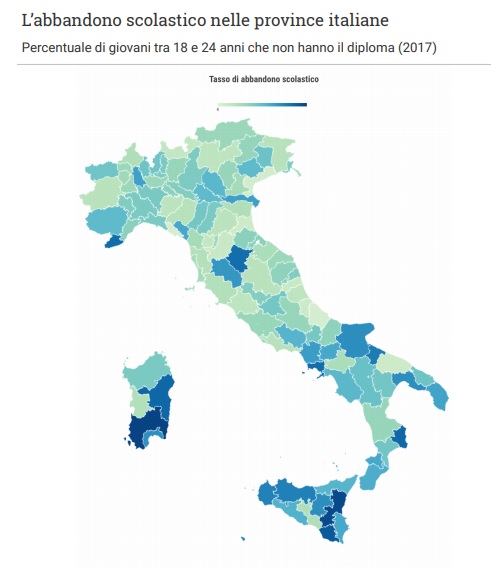 L’abbandono colpisce in modo diverso le aree del Paese. In tre regioni, Sardegna, Sicilia e Calabria, oltre il 20% dei ragazzi ha abbandonato precocemente la scuola. Una quota doppia rispetto al 10% che l’Ue si è posta come obiettivo. In alcune province, come il Sud Sardegna e Catania, oltre un giovane su 4 ha lasciato prima del diploma. A restare indietro sono i giovani più svantaggiati, e anche i territori socialmente ed economicamente più fragili.