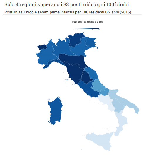 Un’offerta che peraltro non è uniforme sul territorio nazionale. Tra le regioni, solo 4 superano la soglia del 33%: Valle d’Aosta, Umbria, Emilia Romagna e Toscana. Nel Mezzogiorno l’offerta è molto al di sotto non solo dell’obiettivo europeo, ma anche della stessa media nazionale. In Campania, Calabria e Sicilia sono meno di 10 i posti ogni 100 bambini. Parallelamente, anche all’interno di regioni del centro-nord mediamente più servite ci sono realtà dove il servizio è meno diffuso. In Lombardia, ad esempio, la città metropolitana di Milano supera il 33%, mentre la provincia di Sondrio non raggiunge il 20%.