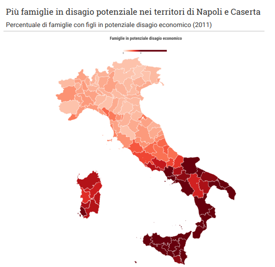 La povertà ha colpito in modo diverso a seconda del territorio. Nel Mezzogiorno le famiglie con almeno un figlio minore in povertà sono il 14,4% del totale, mentre nel centro-nord si attestano sull’8-10%. Ma si tratta di medie solo indicative, perché all’interno di queste macroaree convivono tante realtà diverse: esistono tanti Nord, come esistono tanti Sud.