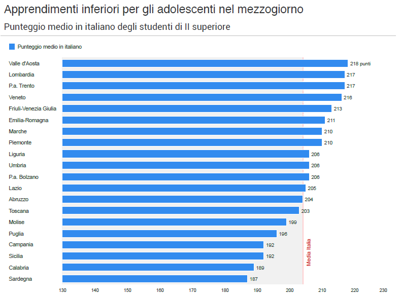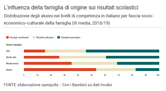 Partiamo dall’istruzione. Tra gli alunni di terza media, all’ultimo anno prima della scelta dell’indirizzo da prendere, i divari sociali sono molto ampi. Chi ha alle spalle una famiglia con status socio-economico-culturale alto, nel 54% dei casi raggiunge risultati buoni o ottimi nelle prove di italiano. Per i loro coetanei più svantaggiati, nel 54% dei casi il risultato è insufficiente.