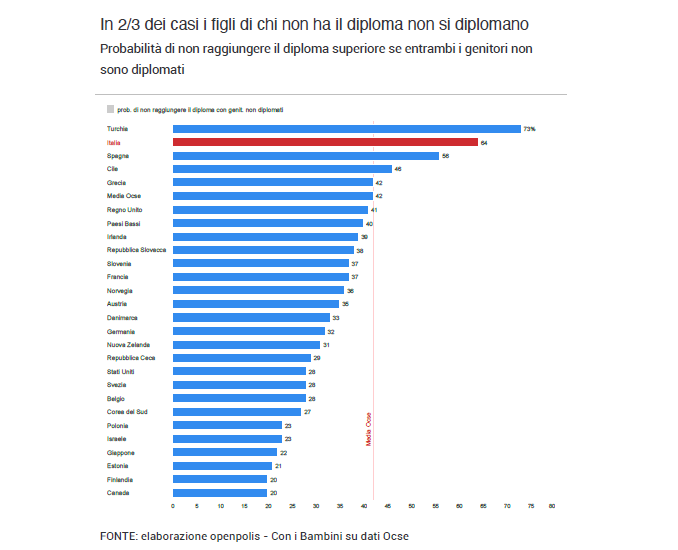 Questi dati ci dicono come la condizione sociale si trasmetta di generazione in generazione. Nascere in una famiglia con meno opportunità da offrire significa generalmente partire già svantaggiato anche sui banchi di scuola. Dai dati sull’abbandono scolastico emerge che i due terzi dei figli con entrambi i genitori senza diploma non si diplomano a loro volta.