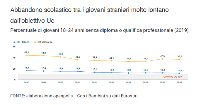 Altra differenza sostanziale si registra prendendo in riferimento la cittadinanza. È di 25,2 il divario in punti percentuali tra l’abbandono dei giovani con cittadinanza straniera e i loro coetanei.
