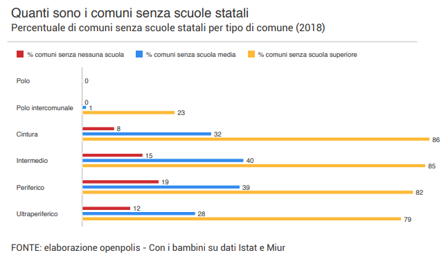 In Italia in media la popolazione con meno di 18 anni rappresenta il 16,2% dei residenti. La concentrazione di minori è più bassa agli opposti della classificazione: nei comuni polo, in gran parte capoluoghi, e nei comuni delle aree interne. Nei comuni periferici e ultraperiferici, la popolazione con meno di 18 anni arriva a malapena al 15%. Mentre la quota cresce fino al 17% nei comuni di cintura, ovvero gli agglomerati urbani attorno alle città maggiori, e nei poli intercomunali. Questi sono gruppi di comuni limitrofi che, sebbene presi da soli non costituiscano un polo, complessivamente offrono un livello di servizi paragonabile a quello dei centri maggiori. Nelle aree interne il ruolo della scuola è importante anche come fattore di coesione territoriale. Allo stesso tempo, per ragioni che chiamano in causa la perifericità di queste zone, l’offerta educativa può risultare compromessa.